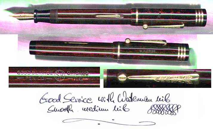 WATERMAN'S Dieser Füller war mit einer Warranted Feder ausgestattet (die Good Service Pen Co. stellte keine eigenen Federn her). Um ihn zu einem guten Gebrauchsfüller zu machen, habe ich ihn mit einer Waterman Feder ausgestattet, die recht flexibel reagiert (siehe Schriftprobe). - This pen was equipped with a Warranted nib (the Good Service Co. did not produce own nibs). To get a nice user pen I changed the nib with a Waterman nib, which has some flexibility (see proove above). |