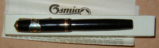 | Besonderheiten - Particularities | Osmia Kolbenfüller, neu und unbenutzt mit Box, Anleitung und original Preissticker (Osmia, 9,90). Länge geschlossen mit Kappe: 12,0 cm. Glatte Oberfläche. Schwarzer Kappenabschluß. Clip Inschrift "Osmia" ohne Firmenzeichen. Schaft Beschriftung "64 und BL". Perfekter Zustand, nur geringe Lagerspuren an den Kappenringen erkennbar. Das transparente Tintenfenster mit einem eingearbeiteten Spinnennetz- Muster. Sehr ungewöhnlich. Die oben unbedruckte Original-Box ist in perfekter Erhaltung und trägt seitlich aufgedruckt: "64 G, schwarz, B schräg". Die Feder ist nachgedunkelt, kann aber vom Käufer poliert werden. | Osmia piston filler, new and unused with original box, instructions and price sticker (Osmia 9,90). Length closed with cap: 12.0 cm. Smooth surface. Black cap end. Clip inscription "Osmia" without the Osmia sign. Barrel inscription "64 and BL". Perfect condition, only tiny signs of storage at the cap rings to see. The transparent ink window has a spider web pattern inlaid. Very unusual. The box is in perfect condition and carries "64 G, schwarz, B schräg": at the side. The nib has darkened, can be polished by the highbidder. |