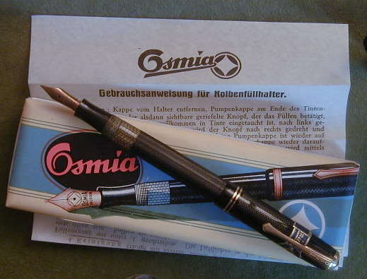 | Besonderheiten - Particularities | Osmia Kolbenfüller, neu und unbenutzt mit Box, Anleitung und original Preissticker. Länge geschlossen mit Kappe: 12,2 cm, mit aufgesetzter Kappe 14,8 cm, Durchmesser Schaft 1,1 cm. Guillochierte Oberfläche. Clip-Inschrift "Osmia". Schaft-Beschriftung "62 G und B". Perfekter Zustand, nur geringe Lagerspuren an den Kappenringen erkennbar. Das transparente Tintenfenster mit einem eingearbeiteten Spinnennetz- Muster. Sehr ungewöhnlich. Die Original-Box ist in perfekter Erhaltung und trägt die Aufschrift: "Osmia" und seitlich aufgedruckt: Kolbenhalter 62 G, schwarz, B. Die Bilder sind nicht sehr gut. Darum habe ich das Bild eines 64 G beigefügt, das die guillochierte Oberfläche deutlicher zeigt. | Osmia piston filler, new and unused with original box, instructions and price sticker. Length closed with cap: 12.2 cm, with cap on 14.8 cm, diameter 1.1 cm. Chased pattern. Clip inscription "Osmia" and the Osmia sign. Barrel inscription "62 G and B". Perfect condition, only tiny signs of storing at the cap rings to see. The transparent ink window has a spider web pattern inlaid. Very unusual. The box is in perfect condition and carries: "Osmia", and "Kolbenhalter 64 G, schwarz, F" on the side. Pictures are not very good. So i added a picture of a 64 G with same guilloched surface. |