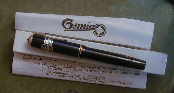 | Besonderheiten - Particularities | Osmia Kolbenfüller, neu und unbenutzt mit Box, Anleitung und original Preissticker (Osmia, 9,90). Länge geschlossen mit Kappe: 12,0 cm. Glatte Oberfläche. Schwarzer Kappenabschluß. Clip Inschrift "Osmia". Schaft Beschriftung "64 und BBL". Perfekter Zustand, nur geringe Lagerspuren an den Kappenringen erkennbar. Das transparente Tintenfenster mit einem eingearbeiteten Spinnennetz- Muster. Sehr ungewöhnlich. Die oben unbedruckte Original-Box ist in perfekter Erhaltung und trägt seitlich aufgedruckt: "64 G, schwarz, BB schräg". | Osmia piston filler, new and unused with original box, instructions and price sticker (Osmia 9,90). Length closed with cap: 12.0 cm. Smooth surface. Black cap end. Clip inscription "Osmia" without the Osmia sign. Barrel inscription "64 and BL". Perfect condition, only tiny signs of storage at the cap rings to see. The transparent ink window has a spider web pattern inlaid. Very unusual. The box is in perfect condition and carries "64 G, schwarz, BB schräg": at the side. |