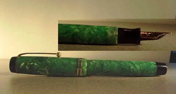 Not much to talk about this pen. The condition of the pen "spoils the eyes", looking at all the formerly green Duofold pens. Especially this green celluloid discoloured too easily. |