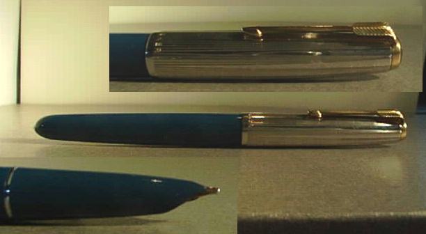 Rolled Silver Cap and blue barrel are unsual versions of the Parker 51. Cap is marked R.Silver. Clip is goldplated. The broad nib make the pen a perfekt writer. Aerometric filler