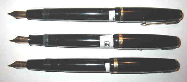 Lot with 3 danish Parker Duofolds. 1 Duofold black, Aerometric, ready to write 1 Duofold in dark blue or green?, Vacumatic, needs repair 1 Duofold Senior, black, Aerometric, ready to write All in beautiful condition. |