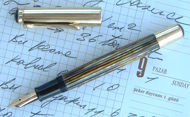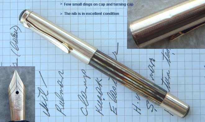 with vertical stripes; see Dittmer/Lehmann, Pelikan Schreibgeräte, page 81; Imprint at barrel end: PELIKAN 500 GÜNTER WAGNER GERMANY imprint in cap band: PELIKAN GÜNTER WAGNER PELIKAN DOUBLÉ L No cracks at the barrel and almost no scratches. Only usual signs of use at the cap and a few small dings on gold filled parts. Overall it is a very attractive pen. Full working and ready to write. Makes a good writer, but also nice for the collection. |
