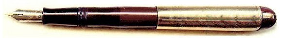 ist der Clip, dessen Verlängerung über den Kappenkopf geführt wird. Hebelfüller aus rotem Pyralin mit Kappe gemarkt 1/10 14 Karat Y.G.F.(vergleichbar mit Walzgold in Deutschland), horizontal gerippt. Standard Größe. Clip mit Doppel-Checkmark, graviert EVERSHARP. Vergoldung der Metallteile sehr gut