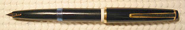 Gold-Feder. Oberfläche etwas stumpf, aber keine Risse oder Kratzer zu sehen. Kleiner Riss an der Clipschraube, die Funktionsfähigkeit wird dadurch aber nicht beeinflusst. Vergoldung sehr gut. Der Kolben ist etwas schwergängig, aber voll funktionsfähig und schreibbereit. Schreibt schön weich. Siehe auch Rösler/Wallrafen Seite 55 |