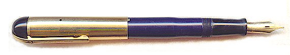 ist der Clip, dessen Verlängerung über den Kappenkopf geführt wird. Hebelfüller aus blauem Pyralin mit Kappe gemarkt 1/10 14 Karat Y.G.F.(vergleichbar mit Walzgold in Deutschland), horizontal gerippt. Standard Größe. Clip mit Doppel-Checkmark, graviert EVERSHARP. Vergoldung der Metallteile sehr gut