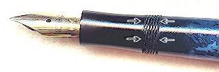 colors. Another particularity is the cap of this pen, which has no imprint and therefore it is likely a replacement cap. This pen has been well used, however is optically still in an almost perfect condition. One time it has been broken beneath the section and above the threads, but fortunatelly no bits of material were lost. After insertion of a new sac it has been mended by a special method, whereby the glue and the fixation have been applied from the inside. The repair is not visible from the outside. Only a few small bumps in the the area of the threads. We used some arrows to highlight this area on an enlarged display As mentioned before, the pen has a new sac and is in a condition to be filled and to be written with. Still we recommend not to use it as a daily writer, but as a collectors item which should be used on special occasions only Apart from the aforementioned points, the cap and the barrel are in an excellent condition. Very neat and attractive. Cap and barrel show no discoloration. Glossy surface. Imprints at the barrel fairly good, faint on the side, but still readable. The large star is nearly white and highgloss. The clip is perfect. Beautiful big 4810 Masterpiece nib. Whithout the flaws this pen should be considered a five star pen to be treasured in every Montblanc collection. Very rare Pen