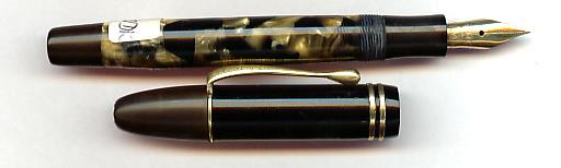 Sehr seltener Stoßfüller Luxusausführung L 30. Schaft perlschwarz marmoriert, Kappe, Hightop und Druckmechanismus schwarz. Diese marmorierten, stromlinienförmigen Meisterstücke werden nur selten öffentlich angeboten. Bereits vor einigen Monaten wurde hier ein fast gleiches Modell angeboten. Ich hatte damals dazu geschrieben: " Laut der damaligen Preisliste gab es dieses Modell in der Kombination perlschwarz mit schwarzer Kappe gar nicht. Normalerweise war auch die Kappe perlschwarz. Bei Rösler gibt es allerdings gar keinen Halter mit Kappe dieser Größe in schwarz mit Hightop. Es ist wahrscheinlich, daß es sich um einen Reparatur-Ersatz von Montblanc handelt. Interessant aber, daß der Clip den selteneren Kugel-Abschluss trägt, nicht den späteren Tropfen-Clip. Dieser Kugel-Clip wurde lt.Rösler nur kurze Zeit zwischen 1930 und 1932 hergestellt. Also auch genau in der Zeit, als dieser Halter gefertigt wurde. Für einen späteren Ersatz spricht aber auch, daß die Kappe keine Aufschrift "Montblanc 4810 Meisterstück" trägt. Übereinstimmend mit dem Katalog von 1932 lautet die Schaft-Aufschrift: SIMPLO Lt. Rösler soll die Inschrift "PATENT angem." lauten. Es scheint bei Montblancs dieser Zeit noch einigen Informations-Nachholbedarf zu geben." Im Gegensatz dazu hat dieser Halter aber anstatt des Kugel-Clips nun einen Tropfen-Clip. Da nun innerhalb kurzer Zeit ein fast identischer L30 aufgetaucht ist, wächst die Wahrscheinlichkeit, daß die Ausführung mit schwarzer Kappe tatsächlich auch so von Montblanc ausgeliefert wurde. Gewissheit werden wir vielleicht erst in einigen Jahren haben. Glänzende Oberfläche. Keine Brüche oder Haarrisse. Keine nennenswerten Kratzer, leichte Gebrauchsspuren an der Kappe. Die Kappenringe sind locker und sollten neu fixiert werden. Kann auf Nachfrage gemacht werden. Die halbflexible 4810 Meisterstück-Feder der Stärke EF ist sehr schön und frei von Kratzern. Der kleine Montblanc Stern im langen Kappenkopf ist weiss und hochglänzend. Die Hartgummi- Enden sind etwas bräunlich verfärbt. An den Celluloid-Teilen ist keine Verfärbung erkennbar. Die Inschrift im Schaft ist klar und deutlich, ebenso wie die Inschriften an der Blindkappe "EF" und "L 30". Länge geschlossen: 13,3 cm Inschrift Schaft: "SIMPLO - ORIGINAL MONTLBANC - D.R.P. 508058"