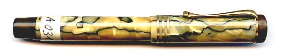 Big and very rare Osmia pushbutton filler in really beautiful condition. From technical view near mint. The hard rubber parts are brownished. The beautiful pattern of the cap seems to be like new. The lower part of the barrel, which is usually covered by the cap, is one step darker. Overall is the barrel round about a half step darker than the cap. Usually are pens with this color very discolored up to a dark brown or green. So this is really a beautiful color with nice pattern. All celluloid parts are glossy without scratches, except minor signs of use at the barrel. No cracks or hairlines. Plating of clip and three cap bands almost near mint. The barrel is engraved clean and clear: "OSMIA EXTRA - SUPRA LUX - Ges. Gesch." I have tried to show the engraving on the lower image by using chalk. The cap top has inlaid the known Osmia sign. Length open with cap on: 16.1 cm The influence of Parker is very clear in this case. The shape is similar to the Parker Duofold Lucky Curves from 1928 (see Lambrou p. 69), but the size and the three cap bands are identical with the Streamline Duofold Seniors from 1929 (see Lambrou, p. 71, nos. 1, 8 + 9). This pen is, beside the minor discolorations, in stunning