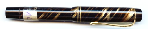 Brown mottled celluloid Piston filler. Piston sucks round about 80% ink. Surface near mint. Cllip very good, but cap bands brassed. Repairs, replatings and adjustments can be done on request for additional costs. Please contact Werner |