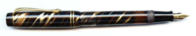 | Besonderheiten - Particularities | Kolbenfüller aus braun marmoriertem Zelluloid. Kolben zieht zu etwa 80%. Oberfläche nahezu fehlerfrei.. Clip sehr gut, Kappenbänder sind abgerieben. Gewünschte Reparaturen, Vergoldungen und Justagen können gegen Bezahlung durchgeführt werden. Anfragen an Werner |