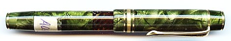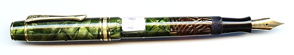 | Besonderheiten - Particularities | Kleiner Kolbenfüller aus grün und perl gestricheltem Zelluloid.
