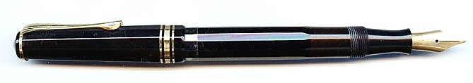 | Besonderheiten - Particularities | 12-seitiger Kolbenfüller aus schwarzem Zelluloid. Kolben zieht zu etwa 50%. Oberfläche mit geringen Gebrauchsspuren. Clip und Kappenbänder sehr gut. Gewünschte Reparaturen, Vergoldungen und Justagen können gegen Bezahlung durchgeführt werden. Anfragen an Werner |