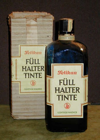 | 1 Liter Nachfüllflasche Eisengallus-Tinte blau mit Original Papp-Verpackung. Flasche und alle Aufkleber in neuwertigem Zustand, Pappverpackung leicht beschädigt. Die Flasche ist noch etwa zur Hälfte gefüllt. Seitenaufschrift: Eisengallustinte außerordentlich dünnflüssig. Mit Gummi-Ausgießer und Schraubverschluß. | Pelikan ferro-gallic blue 1 liter inkbottle with original package. Bottle and all labels in near mint condition, package some damages. The bottle is ca. half full. Printed at the side labels: Eisengallustinte außerordentlich dünnflüssig. With rubber effusor and screw-cap. | ||