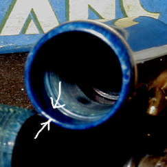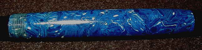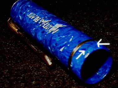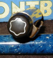 the book. It is a pushbuttonfiller no. 322, "Azuritblue" length closed 12.5 cm (4.92 in.), with cap fixed on the barrel´s end: 15cm (5.91 in.) Cap has one capband and the imprint "Mont Blanc". The cap is absolutely crisp and not a tiny bit discolored. no scratches, Clip and Cap band a little bit polished off. The barrel as well has a very well kept imprint, color shows very slight discoloration but no scratches. Just by accident, we found out, that there is a tiny hairlinecrack in the caplip. The high value was restored by Tom Westerich, (Dr.Ink). He inserted on the lathe a blue celluloid ring of the original celluloid. The spot is marked in the pics, otherwise, you won´ t see it, neither in the pics nor in the original pen. It would need a strong light and very young eyes to see it. Thus, the caplip is reinforced, and normally won´t crack again. After restoration overall a near perfect pen, near mint, very rare. Don´t let him go. Perhaps the only chance to get those beauty. |