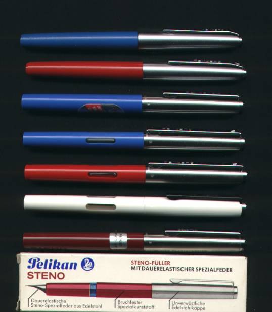 chip. Have been inked, but all were flushed and cleaned again. All following informations from Pelikan book by Dittmer/Lehmann From top to bottom: 6 Pelikanos and 1 Pelikan Steno (shorthand pen) with special nib. Number 3 with sticker: Pelikano P 450 and number 7 with sticker: Pelikano P 470 ST. This also with original box. 1. Pelikano blue 3. version since 1969 2. Pelikano red 4. version since 1973 3. Pelikano blue 5. version since 1979 4. Pelikano blue 7. version since 1989 5. Pelikano red 7. version since 1989 6. Pelikano white 7. version since 1989 7. Pelikan Steno darkred since 1984 |