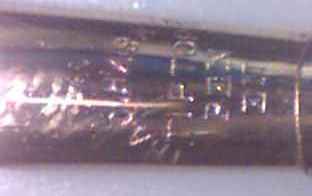Goldfeder. Kommt mit Original Holz-Box (eine Schliesse fehlt). Länge: 16,8 cm, Länge Feder allein: 3,6 cm Der Schaft (vermutlich schwarzes Ebenholz) hat ein vergoldetes Unterteil (mit kleiner Delle) in das die Feder einfach eingesteckt wird. Oberfläche gut erhalten. |