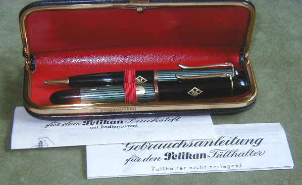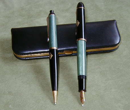 350 jeweils in schwarz/grün. Ohne Gebrauchsspuren, aber mit Werbegravur "O & K". Der Füller mit Aufkleber "F" für die Federstärke. Im schwarzen Leder-Etui mit Gebrauchsanleitungen für beide Schreibgeräte. In diesem Erhaltungszustand selten. |