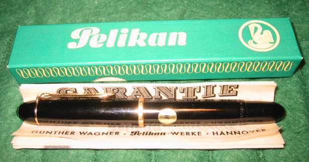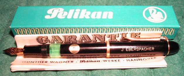Pelikan 140 in near mint condition. Has a advertising on cap "J. Eberspächer". Has been inked, but no signs of use or age visible. Comes in original card box with manual and has still the sticker "M" showing the nib size. Pelikan 140 in black are rarer as the more common in green striped. Not easy to find in this condition. |