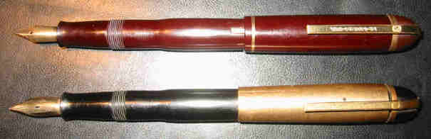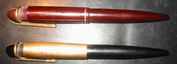 is the "over-the-top-clip" The great number of different colors combinations in 3 sizes (Ladies, Standard, Executive) and some special models was the reason for me, to begin collecting Skylines some years ago. Now I have nearly 100 different Skyline fountain pens, mech. pencils and ball pens. Nevertheless there is no end visible. Please make an offer, if you have unusual or rare Skylines for sale. Lot with 2 Skylines: 1. Lever filler made of red Pyralin. Standard Size. Clip with double check mark, engraved EVERSHARP. Derby loose, must be repaired and needs new sac. 2. Lever filler made of black Pyralin with cap hallmarked 1/10 14 Karat Y.G.F (yellow gold filled). Standard Size. Clip with double check mark, engraved EVERSHARP. Derby loose, must be repaired and needs new sac. Repairs can be done on request for additional costs. |