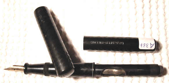 Ein weiterer Füller aus einer kleinen Sammlung sehr alter Hartgummi- Früher Schlauchfüller aus schwarzem Hartgummi mit interessanter Mechanik.In wunderschöner Erhaltung. Hierbei handelt es sich um einen frühen Schlauchfüller. Zum Befüllen wird das hintere Teil vom Schaft abgeschraubt. Darunter befindet sich eine Öffnung mit inliegendem Schlauch und einer Druckstange. Durch drücken des Metalls wird die Luft aus dem Schlauch gedrückt und der Füllvorgang kann erfolgen. Die Kappe hat keinen Clip, wie damals üblich. Es handelt sich aber bereits um eine Schraubkappe. Trotz des hohen Alters ist der Füllhalter in einem fast perfekten Zustand. Tiefschwarz, ohne jede Verfärbung, hochglänzende Oberfläche. Keine Kratzer, keine Risse. Nur die innenliegende Druckstange zeigt Altersspuren. Tiefe und klare Schaft-Inschrift: I.C.S. SELF-FILLING Länge geschlossen: 13,8 cm Über den Hersteller I.C.S. und den Produktionszeitraum ist mir nichts weiter bekannt. Die schöne Herzloch-Goldfeder trägt die Aufschrift "STERLING" und eine 4 in einem Dreieck. Sie ist ziemlich flexibel und ebenfalls in sehr gutem Zustand. |