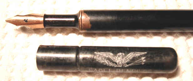 EAGLE coin filling pen, black painted brass. Image "EAGLE" The eagle and the writing at the cap was whitened with chalk for better visibility. Cap and barrel free of scratches. Only the black painting is off partially, so the brass beneath is visible. No cracks or dents. For filling put a coin in the slit So the sac inside is pressed and pen can be filled. For this reason this filling mechanism was called as coin filler. Ready to write, though better used as collectors item. Look at Fischler/Schneiders "blue book", page 271. Same pen,