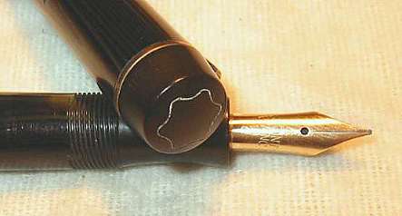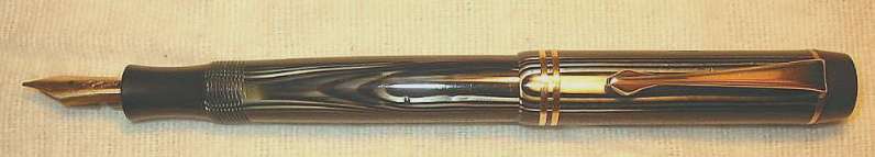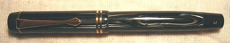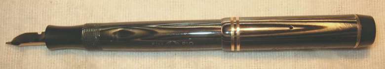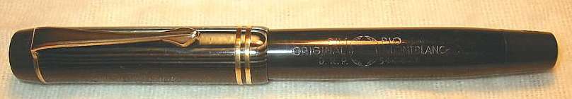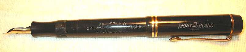 Extremely rare Montblanc 324 PL (black and silver striated) with black hard rubber ends . Very beautiful pen in exellent condition. Almost no scratches and glossy surface at cap and barrel. Wonderful PL pattern, celluloid without discoloration. Deep and crisp imprints at cap: MONTBLANC barrel: SIMPLO ORIGINAL MONTBLANC D.R.P 544477 and blind cap: 324 and M Has working sac. Pen is ready to write. Clip and cap rings has been 24 ct gold electro replated. With a magnifying glass is a single, tiny hairline visible at the caplip. Furthermore little bit darkening of the hard rubber ends. That´s all negative, I´ve found. So what is so extraordinary with this pen? First, there is the PL design, really beautiful looking. Usually it was used for Masterpieces only, but there is also a Stylo 421 in Röslers book and a 222 PL in Lambrous book. Second unusual detail are the two cap rings. Usually to find at pens of the second line only. But there are also two 324s (in azurith and black and pearl) with two cap rings in Röslers book. Furthermore has this pen the correct clip and lined star for pens of the third line. For comparison see also Rösler page 83 (324 with 2 cap rings) and Lambrou page 265 (222 PL). Smooth writer with highflexible nib, size M. Perhaps the only chance to complete your collection. More informations about the numeration of the MONTBLANC fountain pens of the 30s in the Enter-Net bibliothek. EXTREMELY RARE! |