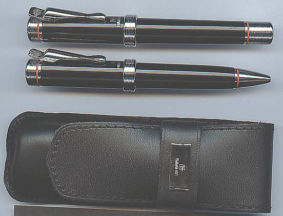 Near mint set with cartridge filler, ball pen and black leather case. Was inked, but flawless condition. Small advertising "Yamaha HiFi". Two tone nib. Heavy quality. |