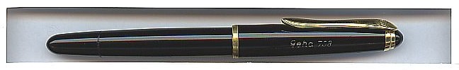| Besonderheiten - Particularities | Geha Kolbenfüller mit Reservetank. Verdeckte Feder. Schaft und Metallteile der Kappe in exellentem Zustand. Ein Riss geht quer durch die Kappeninschrift (ca.3 cm). Wenn bei diesem Kolbenfüller der normale Tintenvorrat zu Ende geht, wird der kleine grüne Knopf am Tintenleiter eingedrückt und man kann ohne Nachfüllen noch einige Zeit schreiben. Ein interessantes Geha-Patent. Voll funktionsfähig und schreibbereit. |