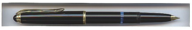 Geha piston filler with reserve tank. Hooded nib. Barrel and metal parts of the cap in excellent condition. There is a crack through the cap inscription (c. 3 cm) When the ink is empty, a little green button can be pushed for initiate the ink reserve. Very interesting Geha patent. Full working and ready to write! |