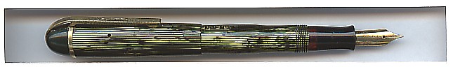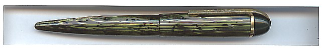 1941 the dramatic styled Skyline pens and pencils were introduced. They represented a completely new design, mechanically and in style. Designed by Henry Dreyfuss was the Skyline the first writing instrument presented in the Museum Of Modern Art in New York. The tapered pen end was very useable for dialing the old phones. Otherwise with cap on looking like a common fountain pen. Another particularity is the "over-the-top-clip". This is the rare full green striped version. Harder to find are only