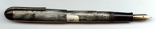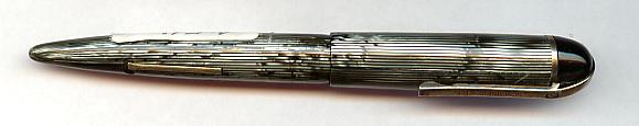 1941 the dramatic styled Skyline pens and pencils were introduced. They represented a completely new design, mechanically and in style. Designed by Henry Dreyfuss was the Skyline the first writing instrument presented in the Museum Of Modern Art in New York. The tapered pen end was very useable for dialing the old phones. Otherwise with cap on looking like a common fountain pen. Another particularity is the "over-the-top-clip". This is the rare full grey (or better described silver/black) striped