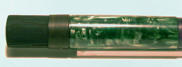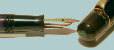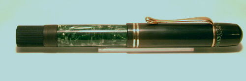| Besonderheiten - Particularities | Dies ist ein Pelikan 100 Kolbenfüllhalter noch mit braunem Sichtfenster und Griffstück und Kappe aus Hartgummi. Die Binde ist sehr auffällig grün marmoriert. Ob es eine schöne Variante der klassischen grünen Binde oder etwas besonderes ist, ist nicht klar bestimmbar. Die Kappe ist ohne crack, Clip und Kappenringe ohne Abrieb. Bis auf die leichte Verfärbung der Hartgummikappe ist der Halter perfekt erhalten. Kommt mit neuer Korkdichtung. | This is a Pelikan 100, an older version still with the brown ink window and grip section and cap made from hard rubber. The green marbled sleeve ist quite unusual with its wild structure. I can´t say, wether it is an elegant variation of the classic green sleeve or something special. The cap is without crack, metal parts without any brassing. Remains the slight discoloration of the cap as an only "fault". Pen comes with a new cork seal. | The nib is a medium oblique 14 carat nib - maybe changed, though of the 100 nibs, I do not have that many. |