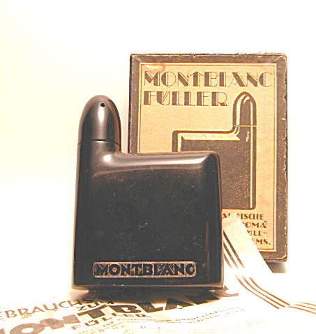 | Besonderheiten - Particularities | Ein solches Tintenfass hat Mont Blanc sich im Jahre 1924 patentieren lassen. Es wurde aus Hartgummi gefertigt, nicht auf der Drehbank, sondern indem es in eine Form gegossen und dann vulcanisiert wurde. Dieses Fass war noch voller Tinte, als wir es fanden, ansonsten praktisch unbenutzt. Die Oberfläche ist spiegelblank. Bemerkenswert ist das Logo Montblanc, das sich am Fusse des Fasses findet. Bis auf die vorsichtigen Bleistiftdekorationen auf der Schachtel und einige wenige Tintenflecken auf der Anleitung ist auch die Verpackung perfekt erhalten. | Such an inkwell was patented by Mont Balnc in 1924. It was not made on the lathe, the rubber was moulded and then vulcanised. This inkwell was still full of ink, otherwise, it is unused (should we say "mint but inked?" The surface is like a mirror. Note the big logo Montblanc at the bottom of the inkwell. Besides some carefully made pencil decorations on the box and two or three inkspots on the papers inside, the box as well is in perfect condition. | Das Tintenfass nennt sich zwar "Mont Blanc Füller", hat aber leider keine Feder. The inkwell is named "Mont Blanc Füller" and Füller in German has the same meaning as "Pen", but this Füller unfortunately has no nib to grade here. :-) |