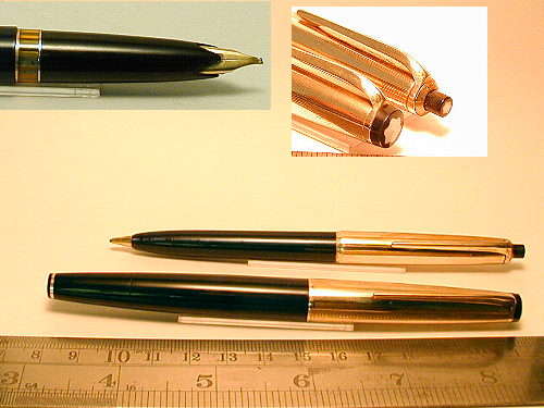 with a rolled gold cap and black barrel. Fountain is near mint, shows no scratch or ding, no brassing at all. The nib is a OBB 14 carat nib. The Pix is in very good condition as well, only has some brassing on a small spot on the backside of the Rolled gold top. |