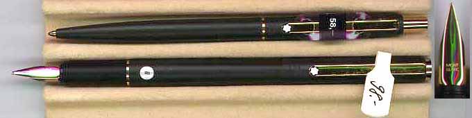Pen / Ballpen Set Cartridge filled, laquered brass, dark green matt finish, inlaid MB star in barrel and cap end. Eventually predecessor to the Montblanc Noblesse. Length of pen closed 5 7/16 inches. Nice heft due to brass construction. Nice writer. Retail in Switzerland was SFR 98.00. and SFR 58.00 for ballpen. |