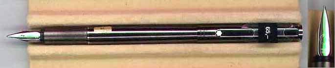 The last ones out of my box: Cartridge filled, brass with metal finish titan colored, inlaid MB star in barrel and cap end. Eventually predecessor to the Montblanc Noblesse. Length closed 5 7/16 inches. Nice heft due to brass construction. Nice writer. Original price sticker shows, that this pen was sold in Switzerland for SFR 65.00. |