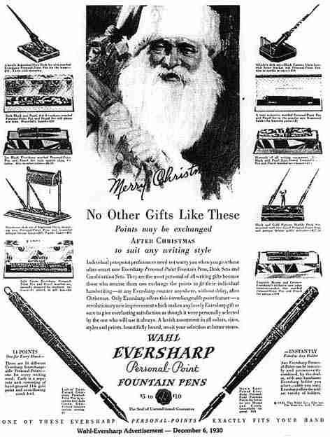 Ein jadegrünes Modell ist abgebildet in: Paul Erano schreibt in seinem Buch: "1929 stellte Wahl einen wunderschön gemachten zylindrischen Füller vor, der den Kunden eine Auswahl von 14 "personalisierten" Federn bot, die sofort am Ladentisch in jeden gewünschten Halter geschraubt werden konnten. Das Gold Seal, ein Medaillon mit zwei Häkchen, war Wahl's Equivalent zu Sheaffers White Dot und eine unlimitierte Garantie gegen Defekte. Jeder Füller kam mit Wahl's einzigartigem Roller-Clip. 1930 gestaltete Wahl den neuen Füller stromlinienförmig, um mit den anderen Herstellern mitzuhalten, und kreierte den Equipoised Personal Point Gold Seal. Die neue Equipoised Variante des Personal Point Füllers verjüngte sich in einer sanften Kurve zu beiden Enden hin, anstatt dass er nur abgeschrägt wurde. Wie nur wenige andere Füller, wird dieses Modell von Sammlern hoch geachtet." ————————————— A jade model is pictured in Paul Erano writes in his book: "In 1929, Wahl introduced a beautifully crafted flat-top that offered its customers a choice of fourrteen "personalized" points which could be fitted instantly at the deks counter to any size and style pen holder. The Gold Seal, a medaillon with two check marks was Wahls equivalent of Sheaffer's White Dot and an unconditional guarantee against defects. Each pen featured Wahl's unique roller ball clip. In 1930, Wahl streamlined the new pento keep pace with the other manufacturers and created the Equipoised Personal Point Gold Seal pen. The new Equipoised variant of the Personal Point pen was tapered gracefully to points at each end rather than being squared off. Like few other pens, it is highly regarded by collectors." |