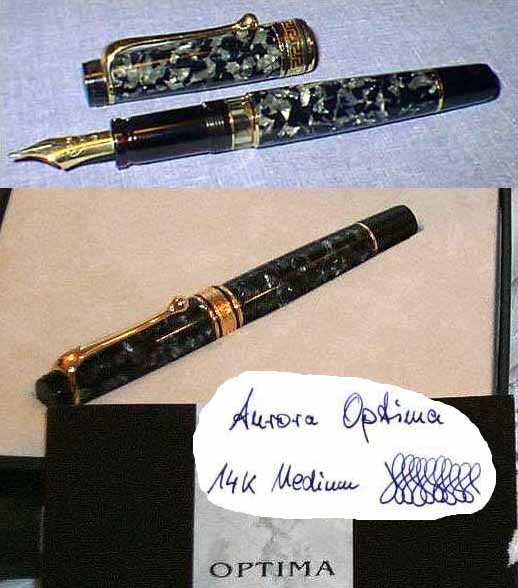 Relisting, because last winner did not send the payment. Seldom offered grey marbled version from the Aurora Optima Series. Out of production, therefore collectible now. The Aurora model with the unique ink reservoire tank. Pen has been tested only. Comes complete with velvet-coated box (not shown), outer box and papers. Retail in Europe was DM 530.- |