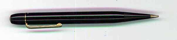twist pencil, black celluloid; length 5 4/16 inches; clip in good shape; surface good, no scratches; for loading unscrew the hardrubber endpiece, shake out the (included) extra lead and stick it into the tube; twist knob above clip made of hardrubber; PENOL was the brand of the OLSEN Co., Copenhagen, who produced Parker pens under license between 1935 and 1963 and Esterbrook between 1946 and 1952 without Parkers knowledge, until a secretary by mistake sent an Esterbrook-letter to Parker - sh... happens! (Pen World Intl. Vol. 10 No. 3) |