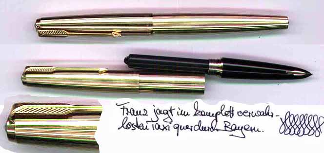 die Patrone ist mit Teflon beschichtet, damit die Tinte aussen nicht haften bleibt; in dieses System hat Parker Unsummen an Entwicklungskosten gesteckt - es hat nichts genützt - der Kugelschreiber war stärker; Kappe und Halter in Dublee (Goldhaube); an beiden Enden befinden sich perlfarbene Endstücke, die von einem vergoldfeten Ring gehalten werden; über der eingelegten Feder ist ein vergoldetes pfeilförmiges Messingteil eingelegt; Kappe und Halter sind in exzellentem Zustand, keine Dellen, keine Kratzer; getestet und gefüllt, wenn man mit diesem Füller schreiben will, sollte man vermeiden, ihn eintrocknen zu lassen, er muss sonst einige Zeit im Tintenglas stehen, bis er wieder schreibbereit ist. |