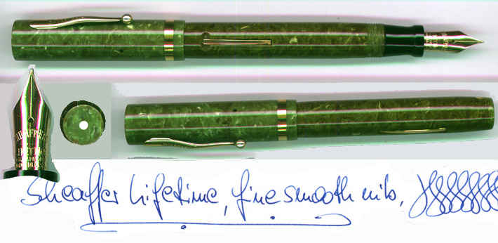 FROM MY PERSONAL COLLECTION: The first pen of all made from cellulose. Large lever filler made of jade green Radite, Sheaffer's name for DuPont's patented cellulose. This pen was the first on the market not made of hard rubber and therefore not limited to the colors black and red. It was a big seller immediately, although it sold for more than $ 8 at its time, which was much money then. The competitors of Sheaffer were forced to react fast to stay on the market. Even the popular big red Parker Duofold made second place against this model. Barrel has darkened consistently. Nothing can be done against it. The