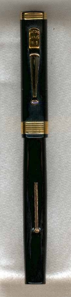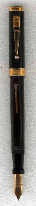 Dieser Swan lässt auch einen Duofold Senior klein erscheinen. Länge geschlossen 14 cm mit aufgesteckter Kappe 17.9 cm Ø an der Kappe 16.5 mm dabei ist er leicht wie eine Feder, nur ca. 20g. Wenn man also grosse Füller liebt und dazu extrafeine Federn, kann man mit diesem Swan und einer einzigen Tintenfüllung vermutlich in einem Rutsch ermüdungsfrei "Krieg und Frieden" abschreiben (...was natürlich als Scherz gemeint ist...es reicht nur für "Faust I"). Für sein Alter ist dieser Swan in hervorragendem Zustand. Das schwarze Hartgummi zeigt keinerlei Verfärbung, allerdings ist die Gravur im Halter recht dünn geworden mit den Jahren und zum Teil nur noch zu erahnen. Aber das Wort "ETERNAL" auf der Seite und "46 E.T.N." am Halterende ist gut zu erkennen, wie ich im Scan versucht habe darzustellen. Die Vergoldung des Hebles hat auch etwas gelitten. Aber bei dem Alter ist das ja auch klein Wunder. Die wirklich riesige Feder (2.5 cm davon schauen aus dem Halter heraus!) ist eine sogenannte Accountant-Feder, wurde also wohl speziell von Buchhaltern geschätzt, weil man so schön klein damit schreiben kann. Der originale Tintenleiter führt die richtige Menge Tinte zu und ist erstaunlich schüttelsicher, wo es bei anderen Füllern gleichen Alters schon kräftig tropft. Ich trenne mich von ihm, weil ich mich vermehrt der Penol-Sammlung widme. |