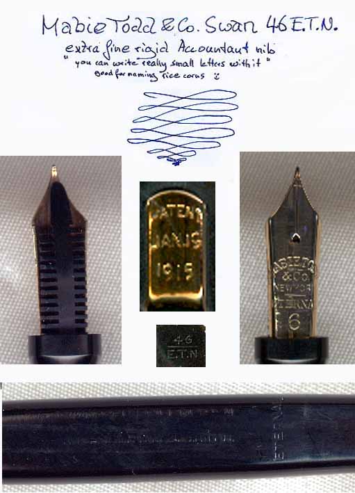 Are you looking for a large pen? I mean - really large? This Swan lets even a Duofold Senior look small. Length closed 14 cm with cap posted 17.9 cm Ø at cap band 16.5 mm and with this size it is light as a feather, just around 20 grams. So, if you like large pens and extrafine nibs, you can fill this Swan once and copy "War and Peace" in one session without getting a cramp (well, its a joke ... the filling lasts only for "Faust I") This Swan is in excellent condition concerning its age. The black hardrubber show no discoloration at all, but the imprint in the barrel has become somewhat weak. Clearly you can see the word "ETERNAL" in the barrel and "46 E.T.N." at the barrel end, as I tried to show in the scan above. The lever shows some brassing, no wonder at this age. The really big nib (2.5 cm of it stick out of the section!) seems to be a so-called Acoountant nib, anyway you can write really small letters. The original feed always brings enough ink to the nibs end plus it is shake-secure when other feeds of the time sprinkle your sheet of paper with nice blobs of ink. |