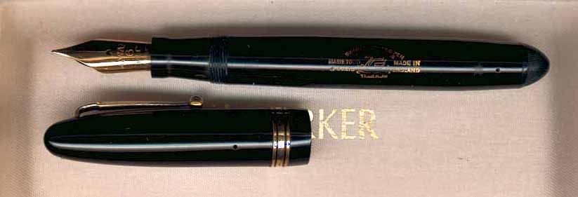 Co. LTD: The Leverless, in the meaning of its name, has no lever. For filling the sack is twisted with a bar inside the barrel. From the outside you only see the twist-knob at the end of the barrel. Twist it half a turn clockwise and the sack is inflated, diip the nib and twist the knob back in position, count to ten and the pen is filled up. Mabie had a patent on this system. The pen has a high gloss surface, I have filled the barrel engraving