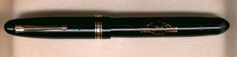 Mabie, Todd & Co. LTD: Der Leverless hat, wie der Name schon sagt, keinen Hebel. Zum Füllen wird der Gummisack von einer Drehstange im Innern des Halters zusammengedreht. Aussen sieht man nur den Drehknopf am Ende des Halters. Eine halbe Umdrehung im Uhrzeigersinn quetscht den Tintensack zusammen, Feder eintauchen, Drehknof in die Ausgangsposition zurückdrehen, bis 10 zählen und der Halter ist gefüllt. Mabie hatte ein Patent auf dieses System. Der Füller hat eine hochglänzende Oberfläche, die Haltergravur