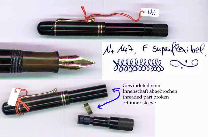 | Besonderheiten - Particularities | Kolbenfüller aus schwarzem Hartgummi (Reibtest bestanden); Gravur im Kappenknopf "Pelikan D.R.P.", vom inneren Schaft ist das Gewindeteil, das den Füllmechanismus hält, abgebrochen und muss wieder eingeleimt werden. Der Korken sollte ebenfalls erneuert werden. |