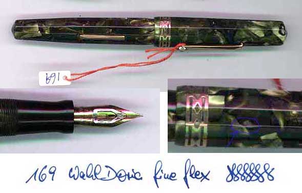 genannt Kashmir; Länge geschlossen 14 cm; Halter etwas dunkler als Kappe (nachgedunkelt); Hebelfüller mit neuem Tintensack; Beschläge zum Teil etwas abgerieben; Zahnspuren am Halterende; Zwei Risse in der Kappenlippe bis zum Kappenring; Nachtrag zum Detail-Foto unten rechts: Hier befindet sich eine kleine Abflachung, in der Kappe eventuell durch Wärmeeinwirkung. So, nachdem ich jetzt, glaub ich, alle Nachteile aufgezählt habe, muss ich trotzdem sagn, dass dies ein seltener und trotz aller Mängel schöner Füller ist! |