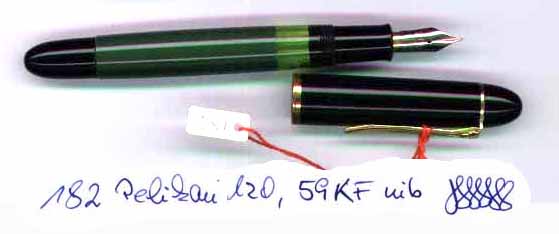 cap band engraved "+PELIKAN 120 GERMANY", "59KF" at lower part of green sleeve; trim and clip brassed; pen fills good. |